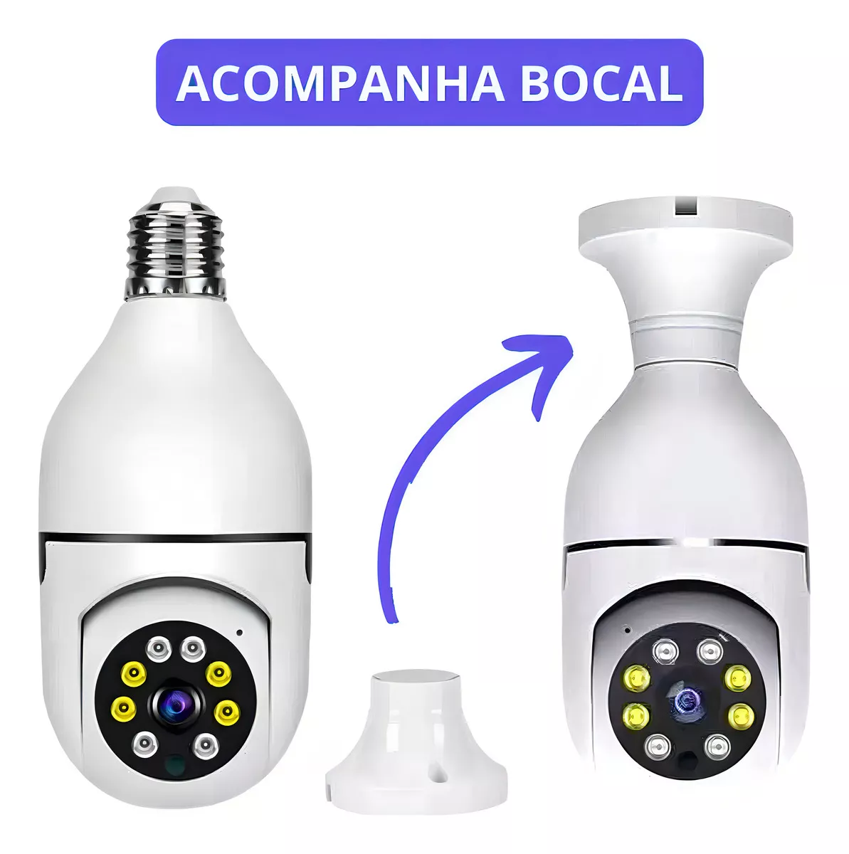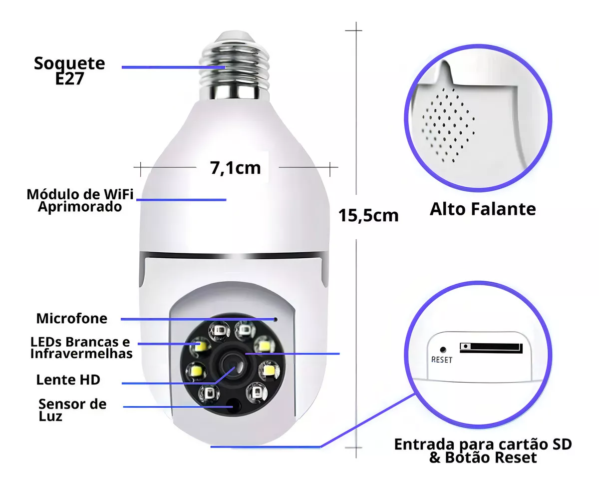 Garanta mais segurança e praticidade para sua casa ou estabelecimento com a Câmera Lâmpada Wi-Fi IP! Com um design discreto semelhante a uma lâmpada comum, ela oferece monitoramento em tempo real, visão noturna colorida, detector de movimento e áudio bidirecional, permitindo que você veja, ouça e interaja de qualquer lugar pelo celular.