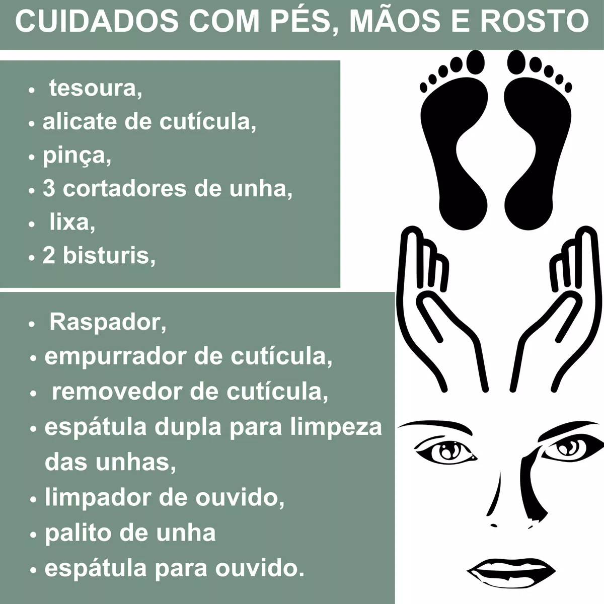 • Acessórios Inclusos: Tesouras, cortadores de unha, pinças, lixas, empurradores de cutícula e mais